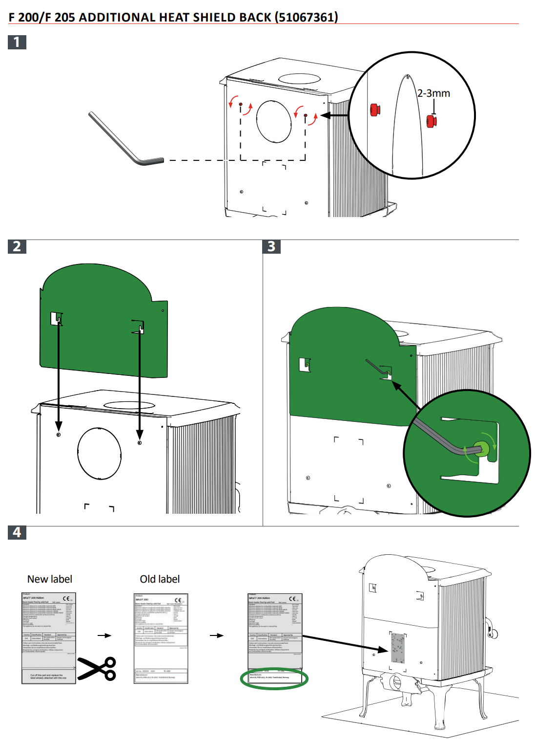 Det er ingen fare eller brannrisiko knyttet til dette, men dersom ovnen er stilt opp nærmere enn 200 mm fra brennbar vegg bak eller 200 mm (F 200) / 225 mm (F 205) fra hjørne, må veggen beskyttes av ekstra varmeskjold. De skal ettermonteres på eksisterende ovn for å redusere bakveggens temperatur og være i henhold til godkjent installasjon.