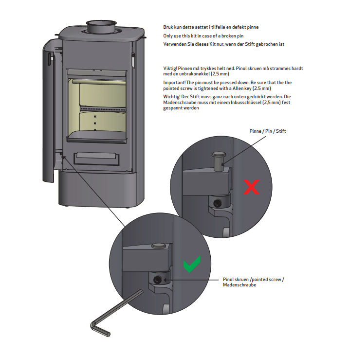 I forbindelse med montering av Jøtul F 360V2 Advance-serien og Jøtul F 370V2 Advance-serien med magnetdørløsning kan den øvre hengselskruen ha feil dimensjon. Dette kan føre til at hengslet løsner fra brennkammeret og glir ut av riktig posisjon. Noe som i verste fall kan føre til skader. Dersom denne skruen på din ovn er løs, vennligst stram den til med en umbraconøkkel, inntil ny korrekt skrue er levert fra Jøtul AS. Jøtul dekker levering av riktig skrue.