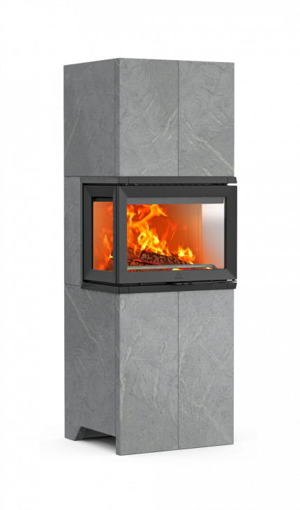 Frittstående og stilren peis med kleberstein. Denne peisen er utformet i samarbeid med designeren Bård Eker, og har tre glass for godt innsyn til flammene både foran og på sidene. Peisen har luftspyling og coating på glassene som sikrer renere glass ved optimal fyring. Døren har en praktisk smekklås og en kubbestopper i brennkammeret som gjør det trygt å fyre i peisen. Kleberstein er et naturlig og varmelagrende materiale som lagrer varme over tid. En brukervennlig ventil på toppen av peisen, gjør det mulig å velge om varmen skal sendes ut i rommet som konveksjonsvarme, eller magasineres i klebersteinen. Med tilleggsutstyr er det mulig å gjøre døren høyrehengslet.