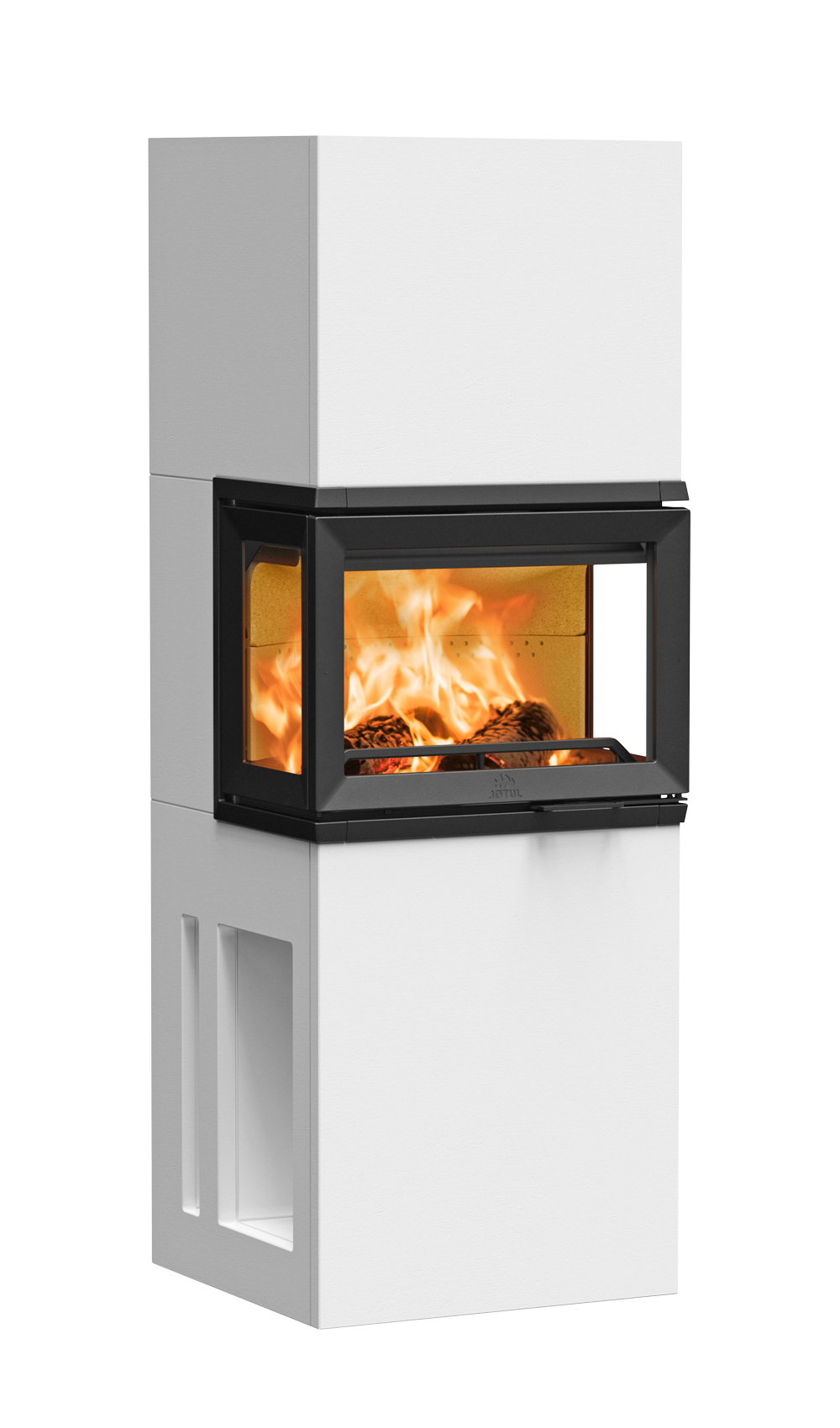 Frittstående peis med tre glass som gir godt innsyn til flammene fra flere steder i rommet. Glasscoating og luftspyling holder glassene renere ved optimalt bruk. Den rentbrennende peisen består av en tilpasset omramming og peisinnsats som er både rask og enkel å montere. Overflaten kan males i valgfri farge umiddelbart etter montering. For å sette ditt personlige preg på peisen, kan du også velge mellom en finere eller grovere overflate. Med sine brukervennlige luftventiler, kubbestopper i brennkammeret og smekklås i døren kan du fyre trygt og enkelt. Med tilleggsutstyr er det mulig å endre døren til høyrehengslet. Til tross for sitt store brennkammer er peisen designet for å brenne godt på lav effekt. Det er også mulighet for varmelagring i toppen.
