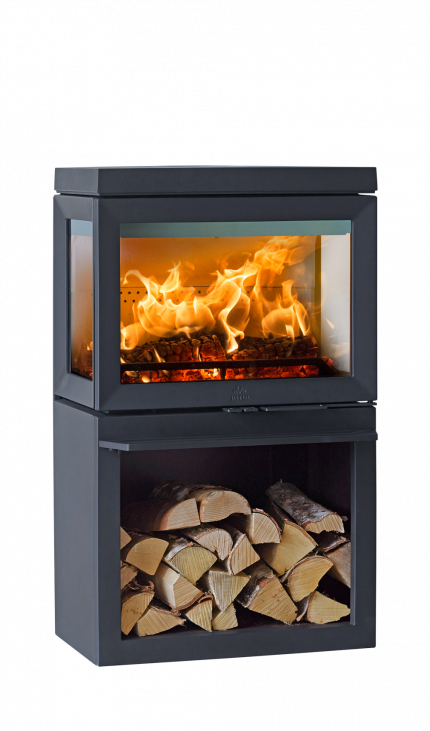 Praktisk og moderne vedovn med tre glass som gir panoramainnsyn til flammene. For å enklere opprettholde renere glass er vedovnen utstyrt med luftspyling som spyler luft ned langs innsiden av glasset. I tillegg har alle de tre store glassene coating som reduserer sotbelegg. Vedovnen er også utstyrt med et romslig oppbevaringsrom i sokkelen til lagring av ved, samt smarte luftventiler som bidrar til enkel opptenning og fyring. De lyse brennplatene inne i vedovnen, gir et lyst og luftig brennkammer, også uten flammer.